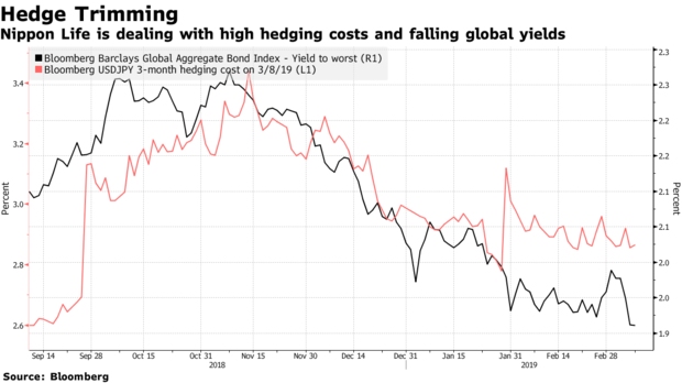 Chi phí phòng vệ rủi ro tiền tệ ngày càng tăng, trong khi lợi suất đầu tư toàn cầu sụt giảm, đã buộc Nippon Life phải đa dạng hóa chiến lược đầu tư của mình. Nguồn: Bloomberg.
