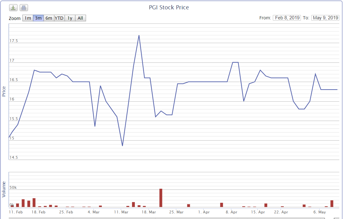 Diễn biến cổ phiếu PGI trong ba tháng gần đây,. Nguồn: VNDirect